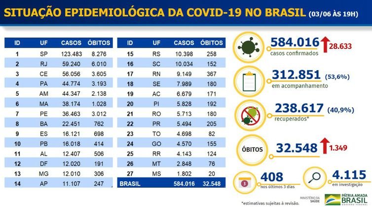 Saúde | Brasil registra 584.016 casos confirmados e 32.548 mortes
