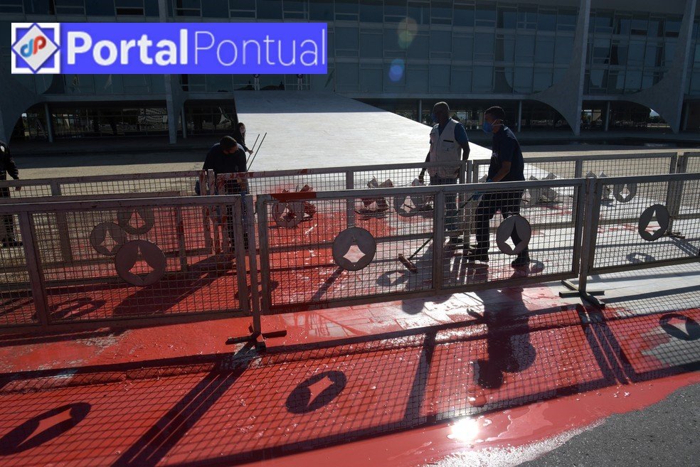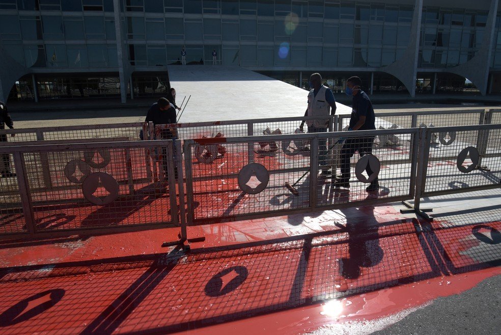Um manifestante jogou uma lata de tinta vermelha na rampa do Palácio do Planalto, em Brasília, na manhã desta segunda-feira (8).