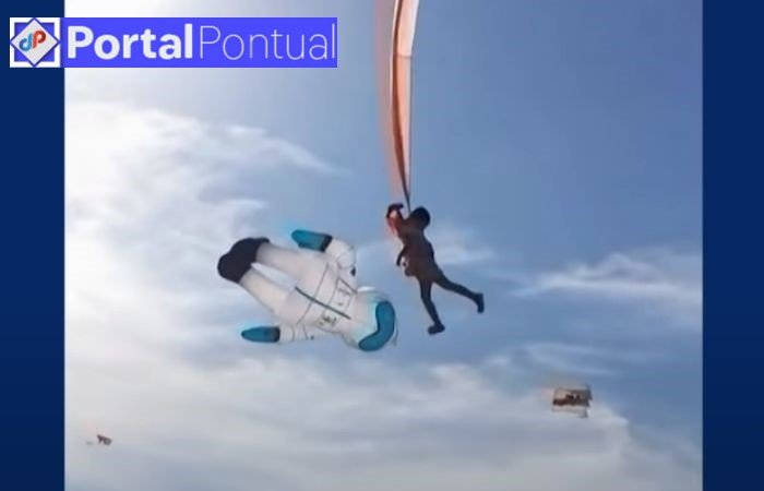 Durante 31 segundos, a menina fica suspensa e é sacudida pelos fortes ventos, até que os participantes do festival conseguem aproveitar um momento em que o vento cede e seguram a criança.