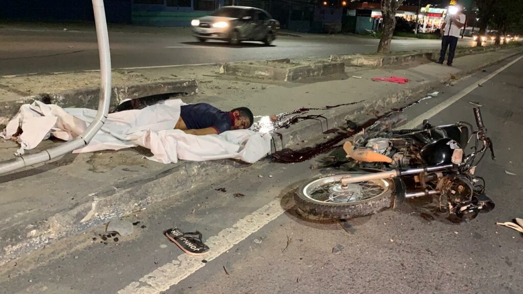 Na noite de ontem, domingo (22), um motociclista teve a cabeça estourada após colidir contra um poste de aço, na Avenida Autaz Mirim, na Zona Leste de Manaus.