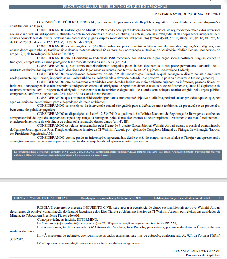 O Ministério Público Federal (MPF), abriu um Inquérito Civil (IC), para apurar a ocorrência de danos socioambientais ao povo Waimiri Atroari decorrentes da possível contaminação do Igarapé Jacutinga e dos Rios Tiaraju e Alalaú, no interior da TI Waimiri Atroari, por rejeitos das atividades de Mineração Taboca, em Presidente Figueiredo (a 128 quilômetros de Manaus).