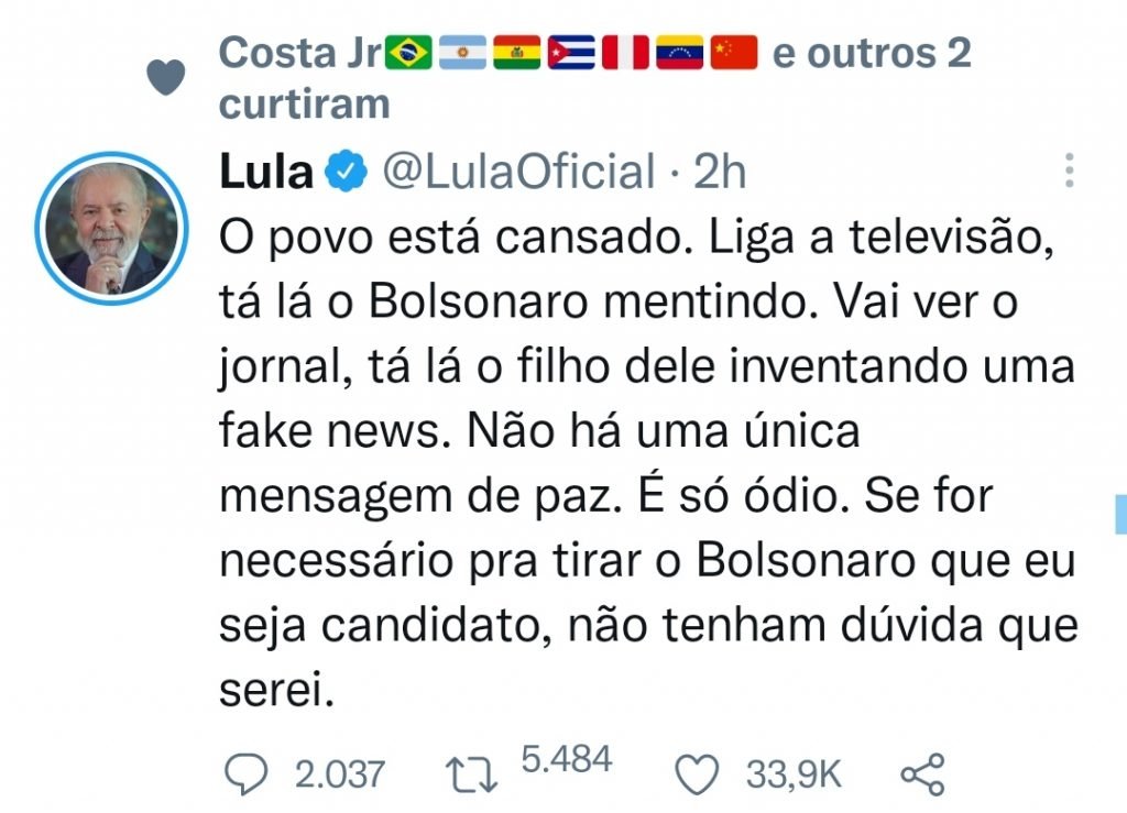 O petista destaca ainda, que não há uma única mensagem de paz. É somente ódio. “Se for necessário para tirar Bolsonaro que eu seja candidato, não tenham dúvida que serei”, disse Lula.
