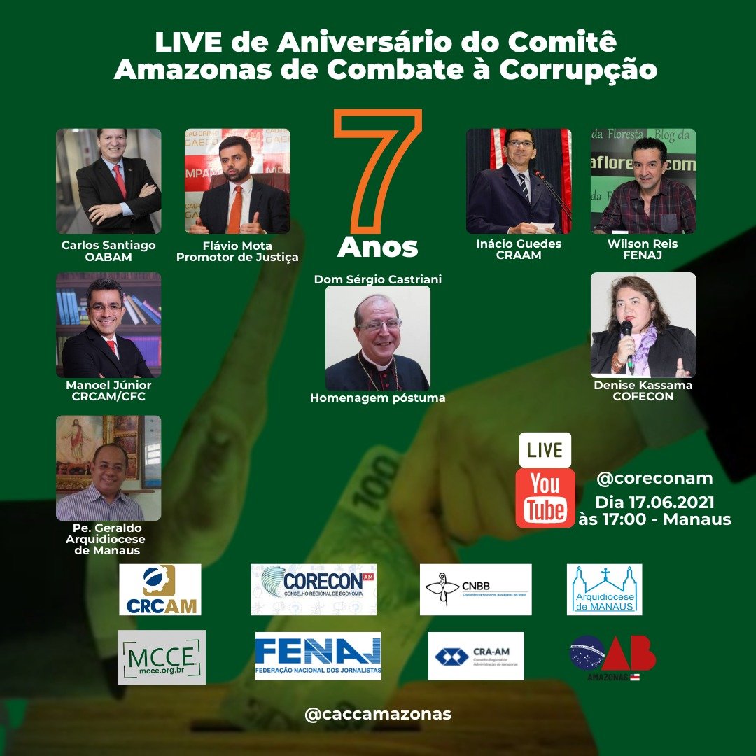 “História e Desafios do Comitê Amazonas de Combate à Corrupção”, é o tema da live de comemoração dos sete anos de existência do Comitê Amazonas de Combate à Corrupção – que é composto por várias entidades, como a Ordem dos Advogados do Brasil – OAB/AM, os Conselhos Regionais Profissionais de Administração, de Contabilidade, de Economia e pelo Sindicato dos Jornalistas no Amazonas/Fenaj e pela Arquidiocese de Manaus, prevista para o dia 17 de junho, às 17h, com transmissão pelo canal do Youtube @coreconam. O evento terá ainda, uma homenagem póstuma ao ex-bispo emérito da cidade de Manaus, Dom Sérgio Castriani, com o lançamento de uma comenda que levará o nome dele.