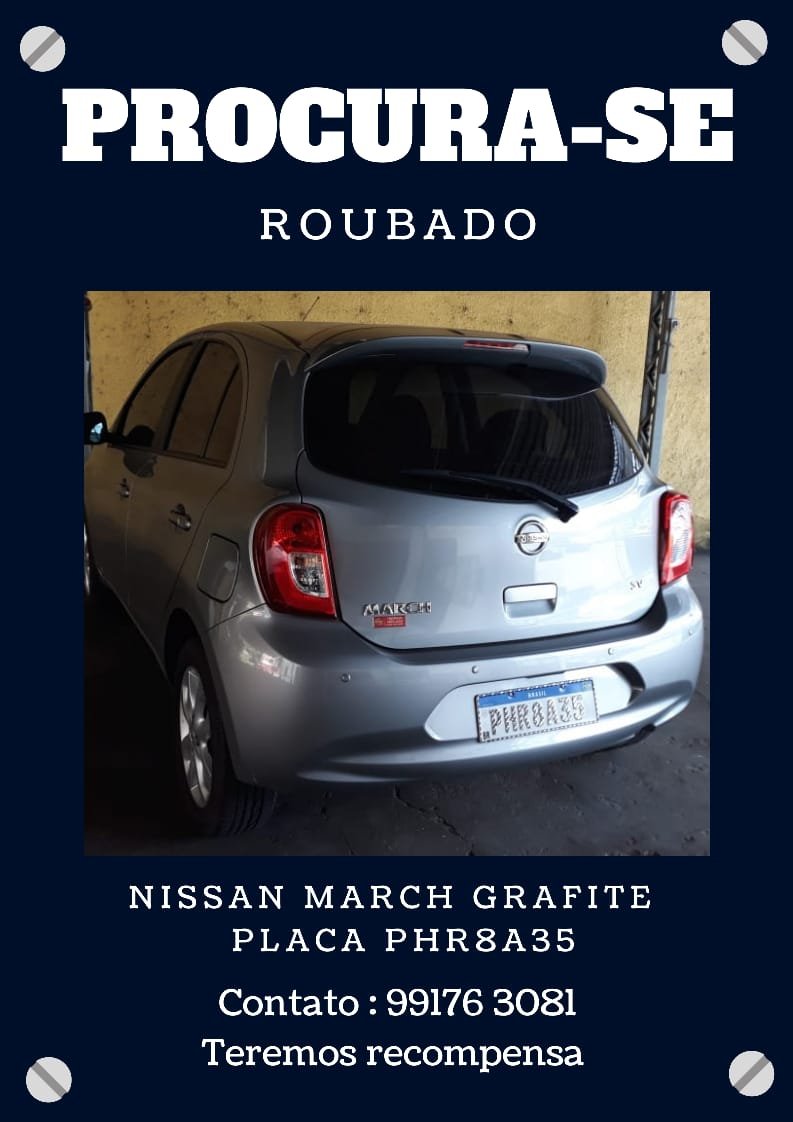 O carro é do modelo Nissan March Grafite, cor cinza, placa PHR8A35. A família dará recompensa para quem encontrar o veículo, basta entrar em contato (92) 99176-3081.