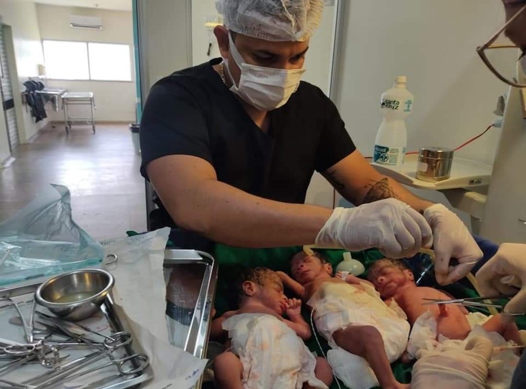 “Essa paciente chegou em trabalho de parto prematuro. Ela estava no oitavo mês de gestação. Todo mundo esperava que era uma gestação de gêmeos. Teve uma ultrassom que um colega fez indicando que eram apenas duas crianças. Para a surpresa de toda a equipe e até mesmo para a mãe, na verdade não eram duas. Eram três”, disse o médico.