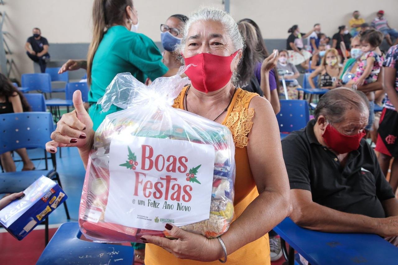 Levando alimento para o Natal de famílias em situação de vulnerabilidade, o Governo do Amazonas realizou, nesta quinta-feira (23/12), a entrega de cestas básicas e caixas de chocolate para moradores do bairro Ouro Verde, na zona leste de Manaus.