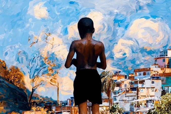 Ali também está a pintura digital “Persistir”, do artista Artedeft. No trabalho, um menino negro está de costas para o observador e de frente para a favela, que se estende diante dele.