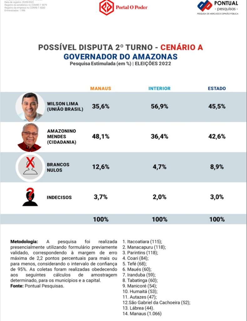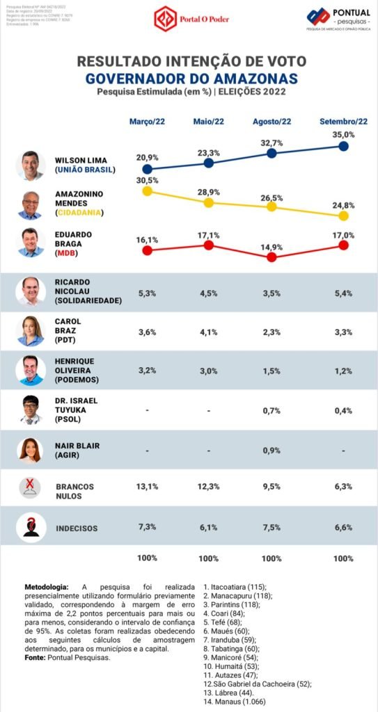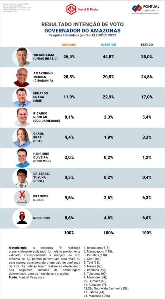 Conforme o estudo, Wilson Lima tem 35,0% das intenções de voto. O segundo lugar ficou para Amazonino Mendes (Cidadania), com 24,8% da preferência dos eleitores. Eduardo Braga (MDB) é o terceiro colocado na pesquisa da Pontual, com um total de 17,0%.