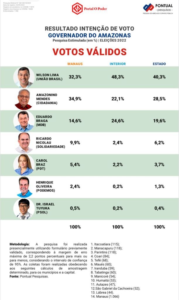 Quanto aos votos válidos, o governador Wilson Lima desponta na liderança. A Pontual Pesquisas indica que o candidato à reeleição tem 40,3% dos votos válidos. O segundo colocado, Amazonino Mendes, registrou 28,5%.