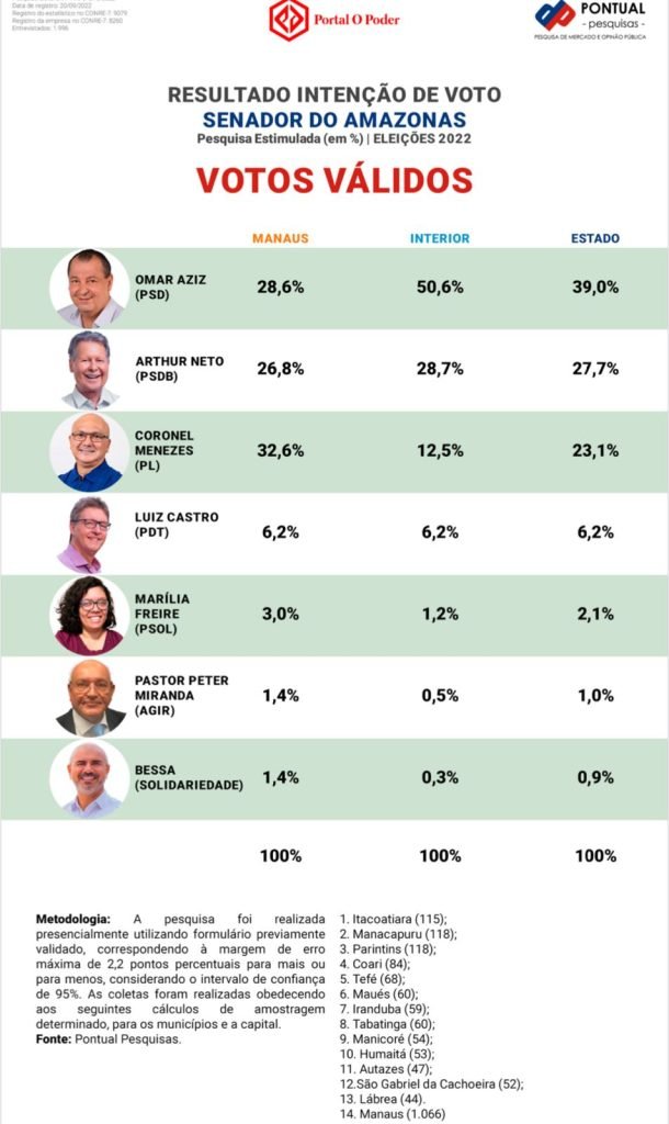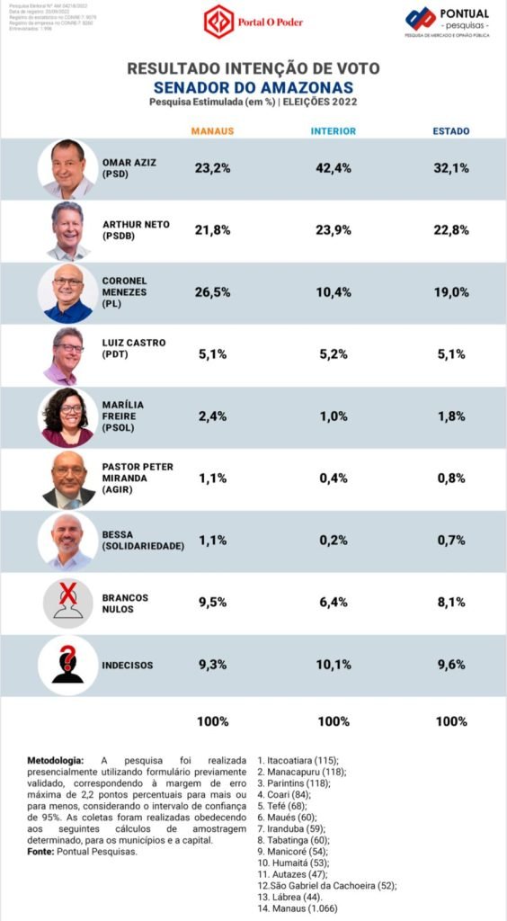 A pesquisa foi realizada em 13 municípios do interior do Amazonas, além da capital Manaus, com eleitores com 16 anos ou mais, com registro eleitoral no município de Manaus e nos 13 municípios e aptos a votar nas Eleições Gerais no Brasil para 2022. A metodologia aplicada pela Pontual Pesquisas obedece à técnica de pesquisa transversal do tipo quantitativa.