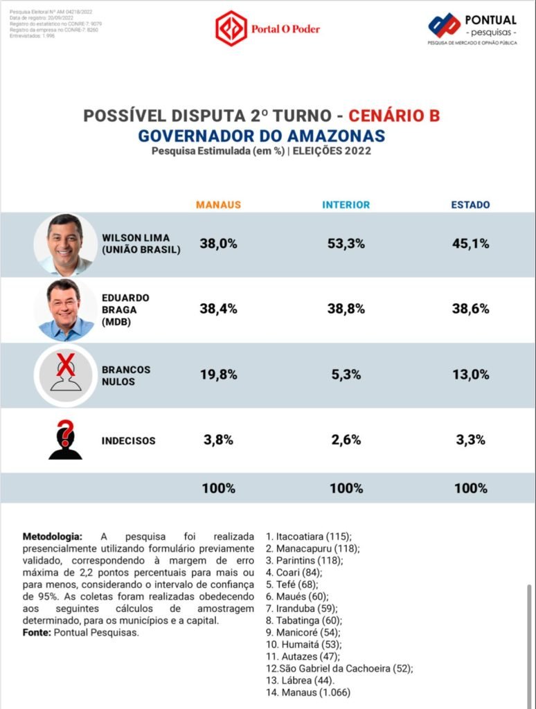 Outro cenário questionado foi entre Wilson Lima e Eduardo Braga. O atual governador do Amazonas apareceu com 45,1% da preferência dos eleitores, enquanto que o adversário ficou com 38,6%.