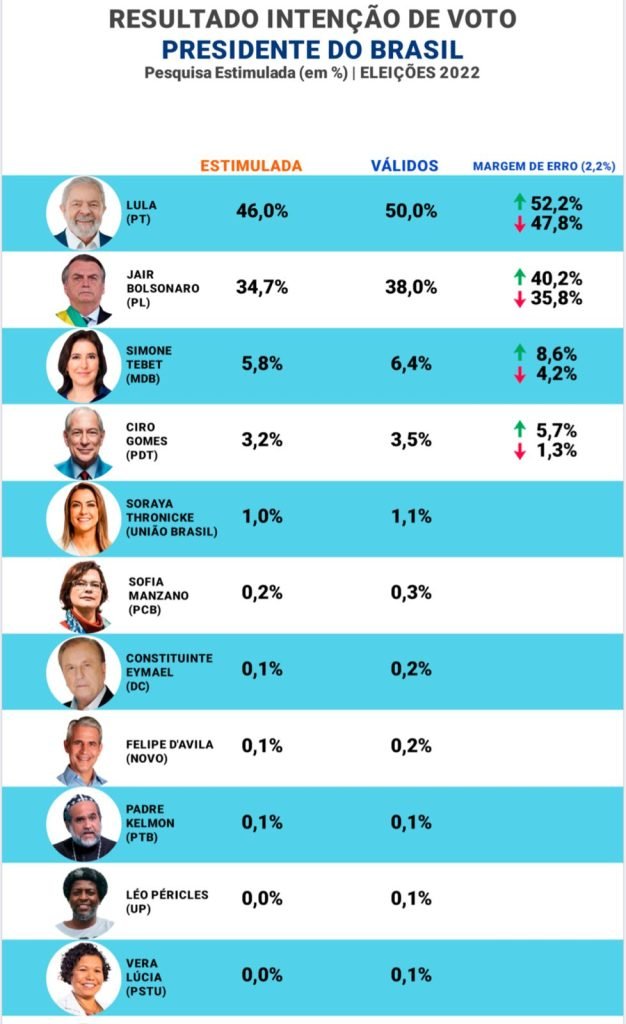 Ciro Gomes (PDT) tem 3,5% seguido de Soraya Thronicke (União Brasil) com 1,1%, Sofia Manzano (PCB) com 0,3%, Constituinte Eymael (DC) com 0,2%, Felipe D’Ávila (NOVO) com 0,2%, Padre Kelmon (PTB) com 0,1%, Léo Péricles (UP) com 0,1% e Vera Lúcia (PSTU) com 0,1%.