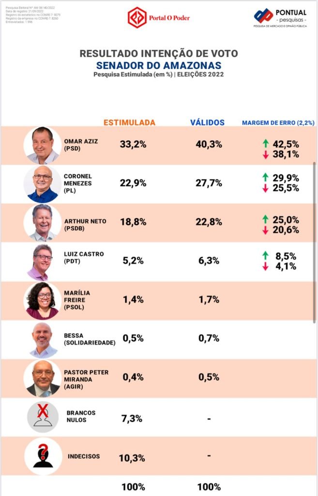 A pesquisa do Instituto Pontual Pesquisas foi realizada em nove municípios do interior do Amazonas além da capital Manaus, com eleitores, de 16 anos ou mais, aptos a votar nas Eleições Gerais de 2022. A metodologia obedece à técnica de pesquisa transversal do tipo quantitativa.