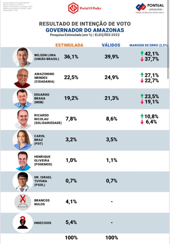 Conforme o estudo, Wilson Lima tem 36,1% das intenções de votos estimulados. O segundo lugar ficou para Amazonino Mendes (Cidadania) com 22,5% da preferência dos eleitores. Eduardo Braga é o terceiro com 19,2%.