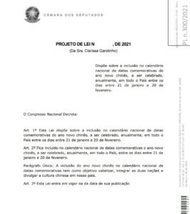 João Luiz menciona ainda no PL que, caso aprovado, a comemoração do Ano Novo chinês durará três dias, podendo se estender até uma semana.